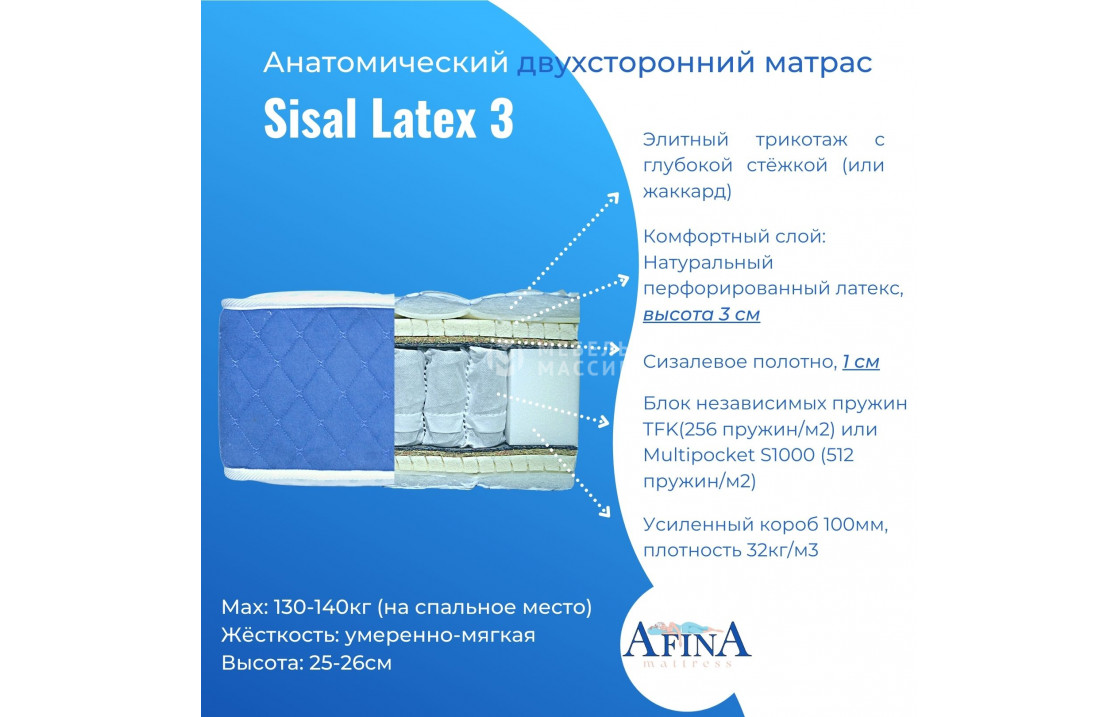 двусторонний Sisal Latex 3 / Sisal Memory 4 от фабрики афина с пружинным блоком tfk-256 (256 пружин на кв. метр) или multi-512 (512 пружин на кв. метр) на выбор. чехол жаккард стёганный 180-220 гр/м2 или элитный трикотаж с объёмной стёжкой 300гр/м2 на выбор. купите по цене производителя в интернет-магазине мебель массив.